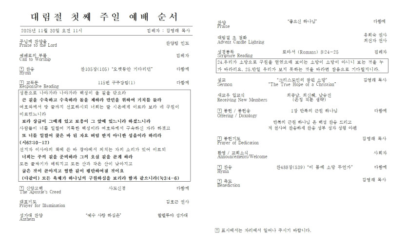 2025년 11월 30일 대림절 첫째 주일 예배 주보